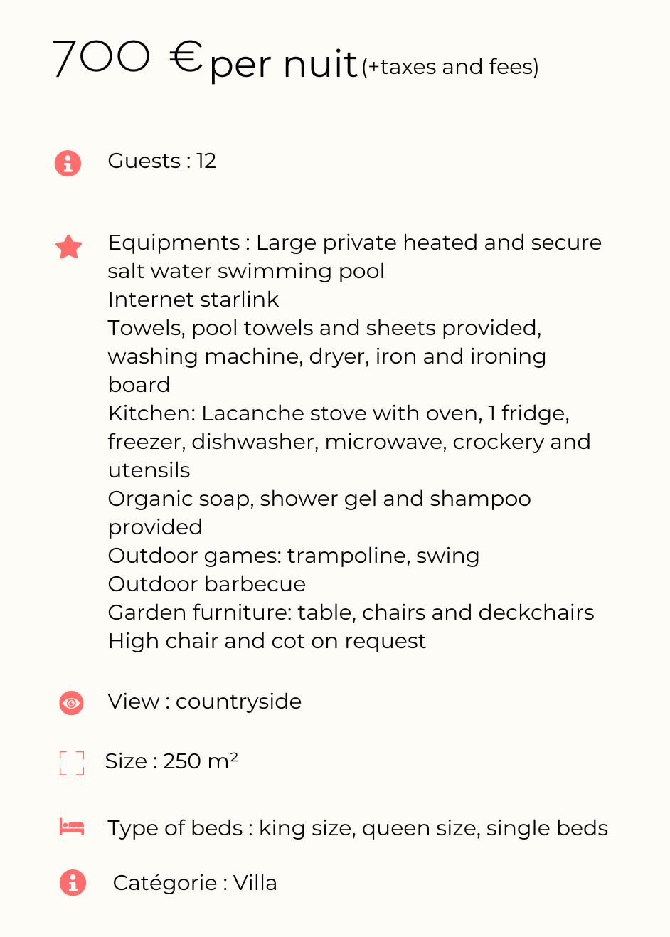 There is a large secure heated, salt swimming pool, spacious garden, 5 bedrooms, 4 shower rooms with WC (1 with bath and shower) separate WC, work area, large furnished outside terrace with BBQ and private parking.